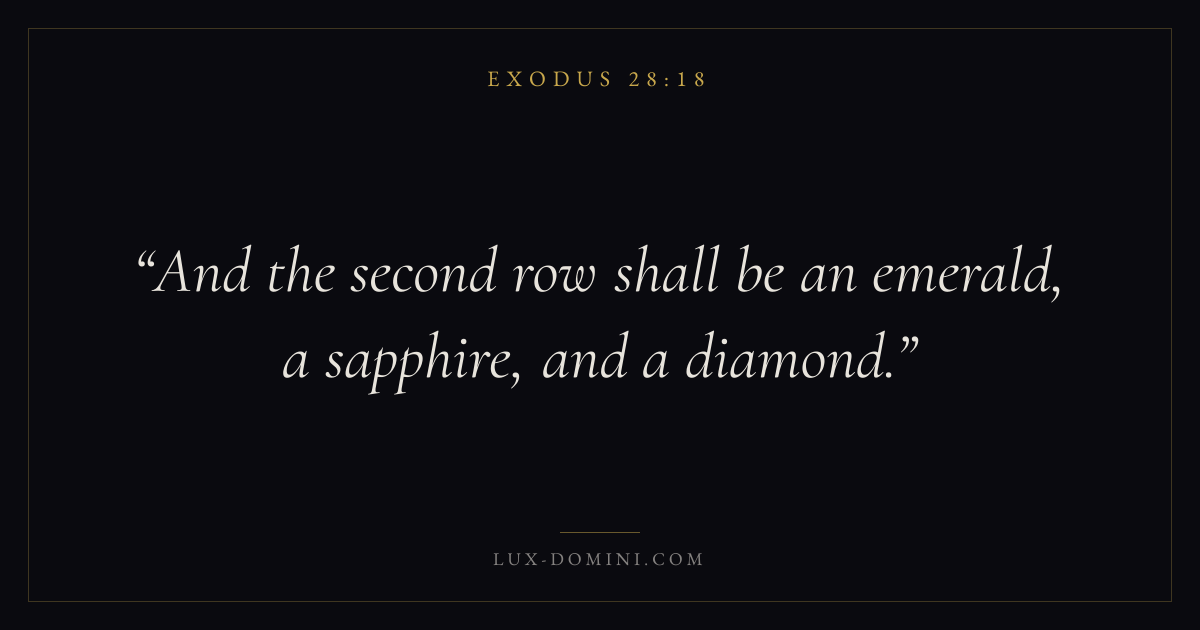 Books / Exodus / Chapter 28 / Verse 18 ← Exodus 28:17 Exodus 28:18 Exodus 28:19 → And the second row shall be an emerald, a sapphire, and a diamond. Download verse card Share on Twitter Share on Facebook Pin it ✦ Key themes SalvationRedemptionPassoverCovenant Read with Exodus 28:16Exodus 28:17John 3:16Ephesians 2:8 Related topics Bible verses about salvation ✦ Exodus Chapter 28 verses V. 1 V. 2 V. 3 V. 4 V. 5 V. 6 V. 7 V. 8 V. 9 V. 10 V. 11 V. 12 V. 13 V. 14 V. 15 V. 16 V. 17 V. 18 V. 19 V. 20 V. 21 V. 22 V. 23 V. 24 V. 25 V. 26 V. 27 V. 28 V. 29 V. 30 V. 31 V. 32 V. 33 V. 34 V. 35 V. 36 V. 37 V. 38 V. 39 V. 40 V. 41 V. 42 V. 43