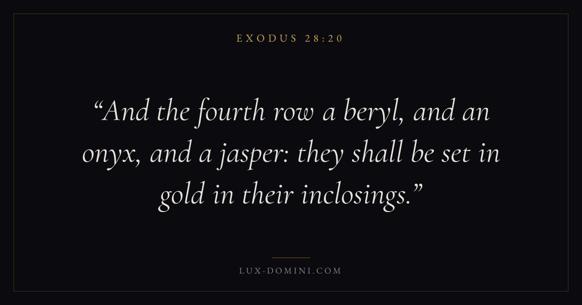 And the fourth row a beryl, and an onyx, and a jasper: they shall be set in gold in their inclosings.