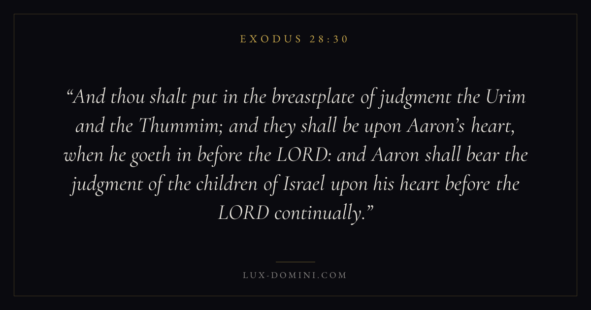 And thou shalt put in the breastplate of judgment the Urim and the Thummim; and they shall be upon Aaron’s heart, when he goeth in before the LORD: and Aaron shall bear the judgment of the children of Israel upon his heart before the LORD continually.