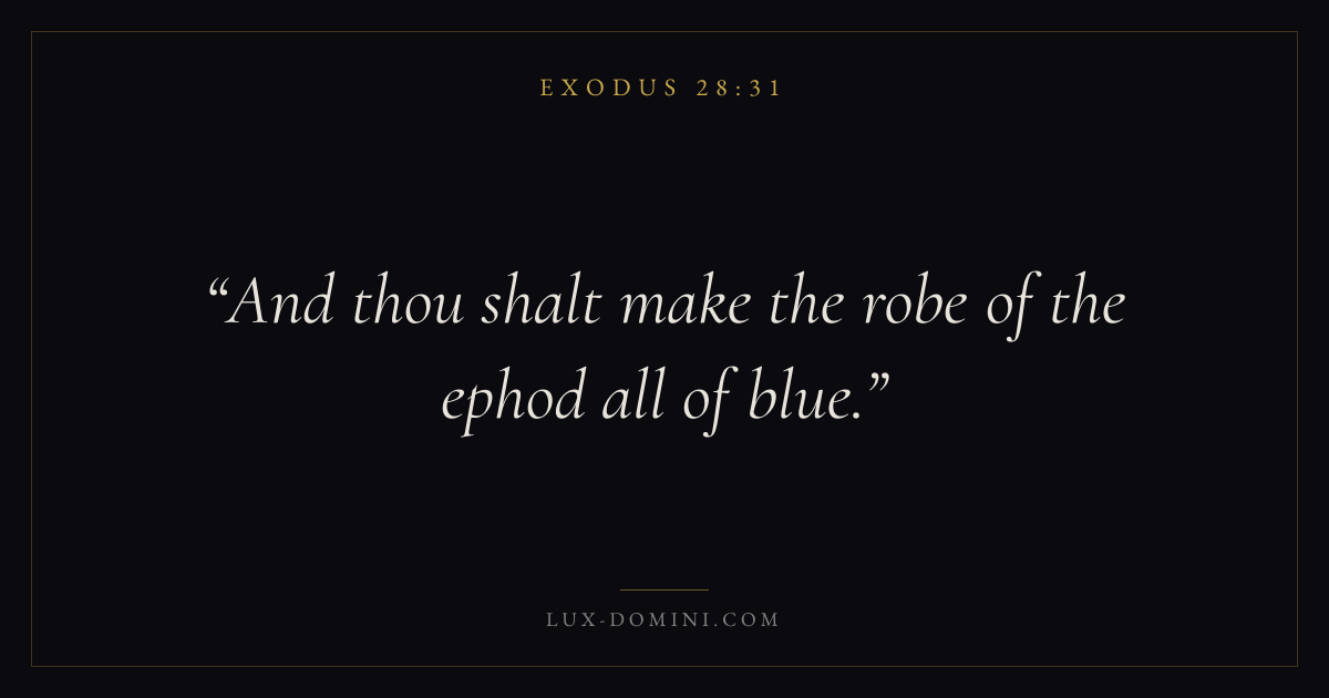 Books / Exodus / Chapter 28 / Verse 31 ← Exodus 28:30 Exodus 28:31 Exodus 28:32 → And thou shalt make the robe of the ephod all of blue. Download verse card Share on Twitter Share on Facebook Pin it ✦ Key themes SalvationRedemptionPassoverCovenant Read with Exodus 28:32John 3:16Ephesians 2:8 Related topics Bible verses about salvation ✦ Exodus Chapter 28 verses V. 1 V. 2 V. 3 V. 4 V. 5 V. 6 V. 7 V. 8 V. 9 V. 10 V. 11 V. 12 V. 13 V. 14 V. 15 V. 16 V. 17 V. 18 V. 19 V. 20 V. 21 V. 22 V. 23 V. 24 V. 25 V. 26 V. 27 V. 28 V. 29 V. 30 V. 31 V. 32 V. 33 V. 34 V. 35 V. 36 V. 37 V. 38 V. 39 V. 40 V. 41 V. 42 V. 43