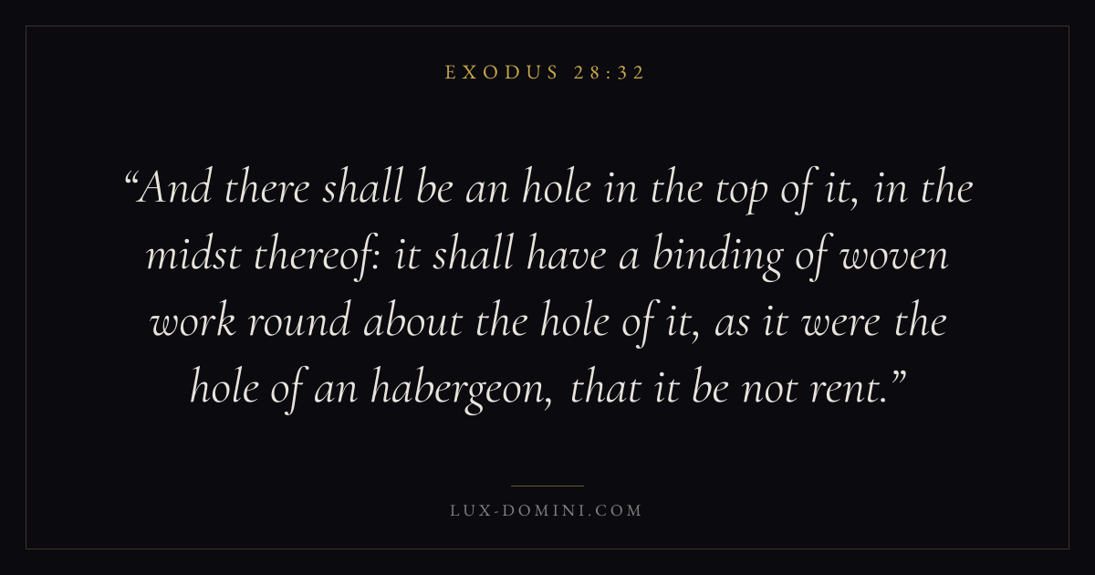 And there shall be an hole in the top of it, in the midst thereof: it shall have a binding of woven work round about the hole of it, as it were the hole of an habergeon, that it be not rent.