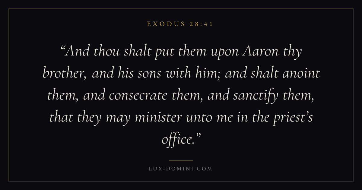 And thou shalt put them upon Aaron thy brother, and his sons with him; and shalt anoint them, and consecrate them, and sanctify them, that they may minister unto me in the priest’s office.