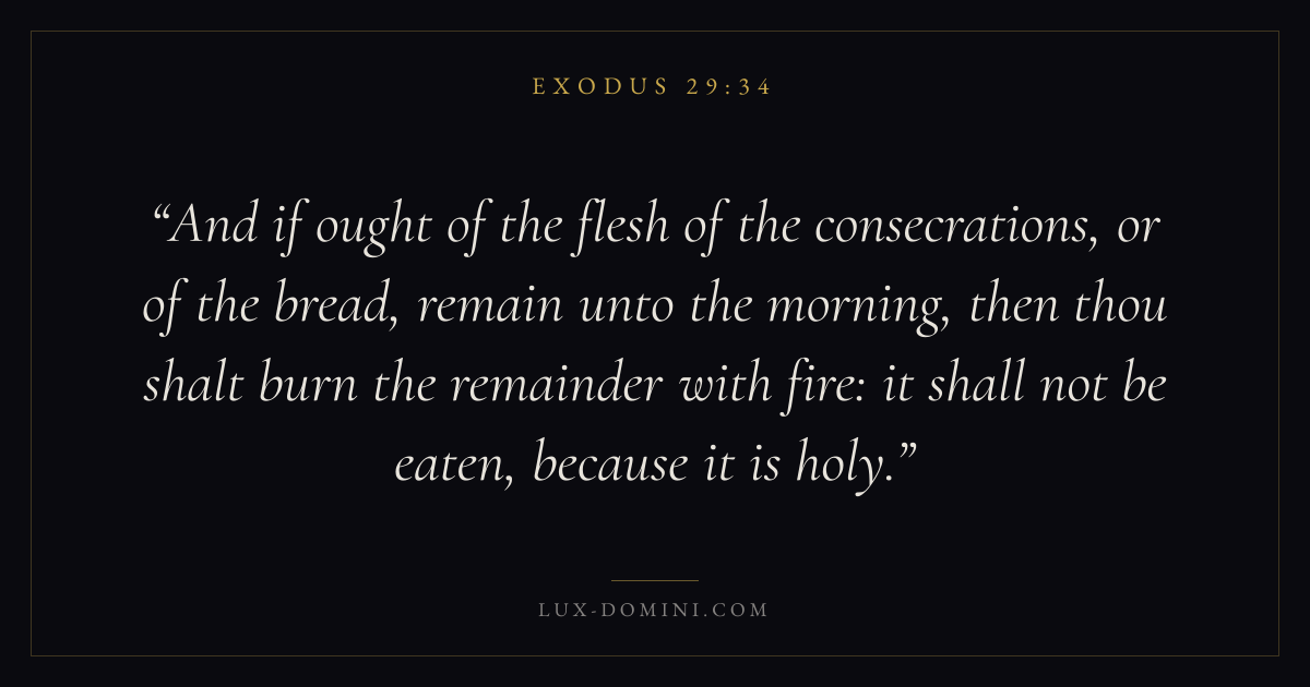 And if ought of the flesh of the consecrations, or of the bread, remain unto the morning, then thou shalt burn the remainder with fire: it shall not be eaten, because it is holy.