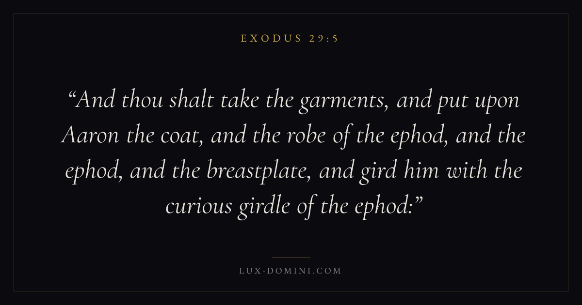 And thou shalt take the garments, and put upon Aaron the coat, and the robe of the ephod, and the ephod, and the breastplate, and gird him with the curious girdle of the ephod:
