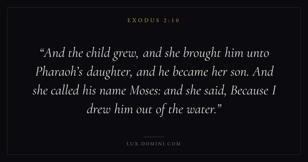 And the child grew, and she brought him unto Pharaoh’s daughter, and he became her son. And she called his name Moses: and she said, Because I drew him out of the water.
