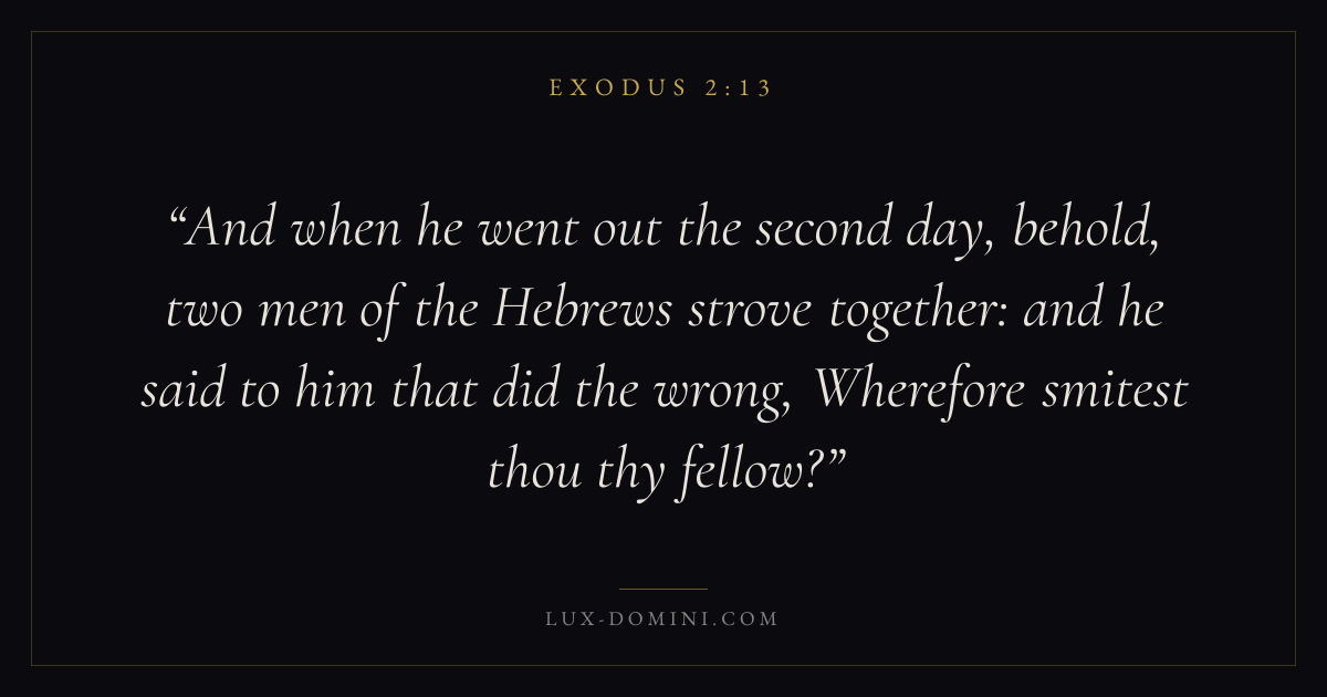 And when he went out the second day, behold, two men of the Hebrews strove together: and he said to him that did the wrong, Wherefore smitest thou thy fellow?