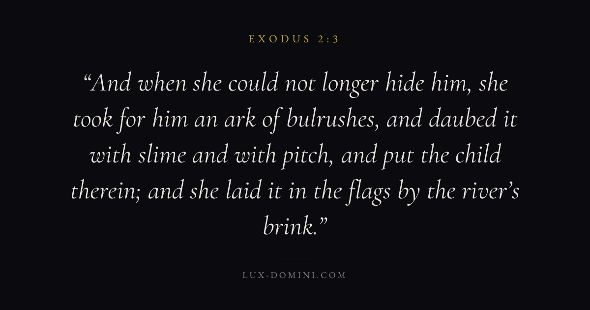 And when she could not longer hide him, she took for him an ark of bulrushes, and daubed it with slime and with pitch, and put the child therein; and she laid it in the flags by the river’s brink.