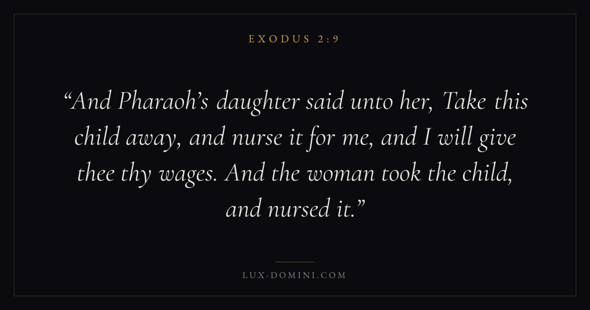 And Pharaoh’s daughter said unto her, Take this child away, and nurse it for me, and I will give thee thy wages. And the woman took the child, and nursed it.