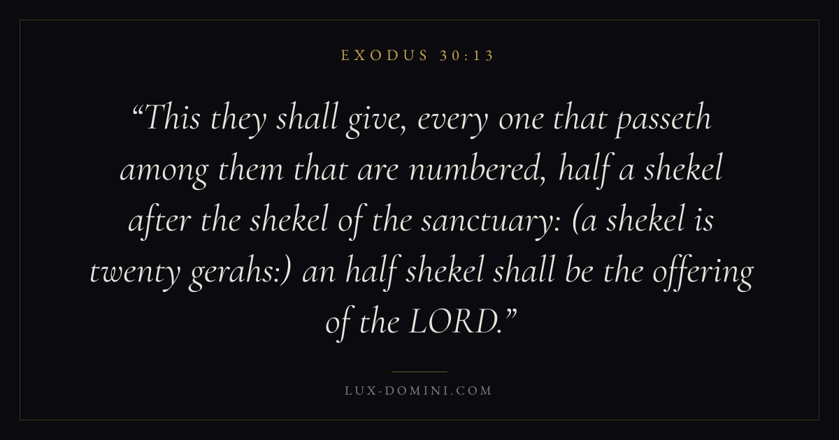This they shall give, every one that passeth among them that are numbered, half a shekel after the shekel of the sanctuary: (a shekel is twenty gerahs:) an half shekel shall be the offering of the LORD.