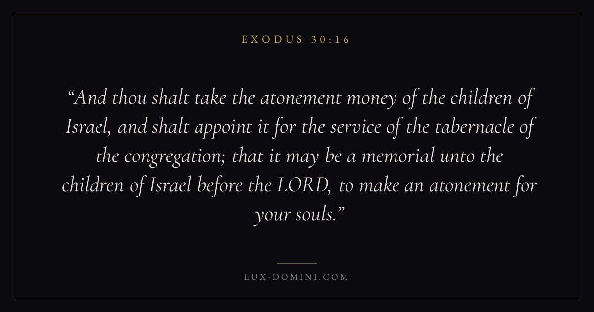 And thou shalt take the atonement money of the children of Israel, and shalt appoint it for the service of the tabernacle of the congregation; that it may be a memorial unto the children of Israel before the LORD, to make an atonement for your souls.