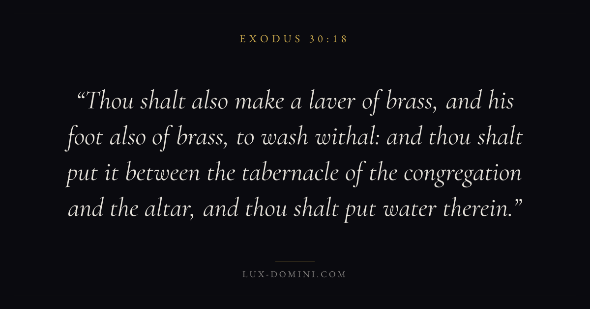 A large vessel of brass, holding water, was to be set near the door of the tabernacle. Aaron and his sons must wash their hands and feet at this laver, every time they went in to minister.