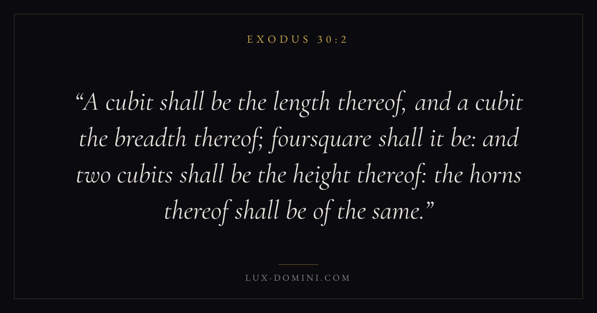 A cubit shall be the length thereof, and a cubit the breadth thereof; foursquare shall it be: and two cubits shall be the height thereof: the horns thereof shall be of the same.