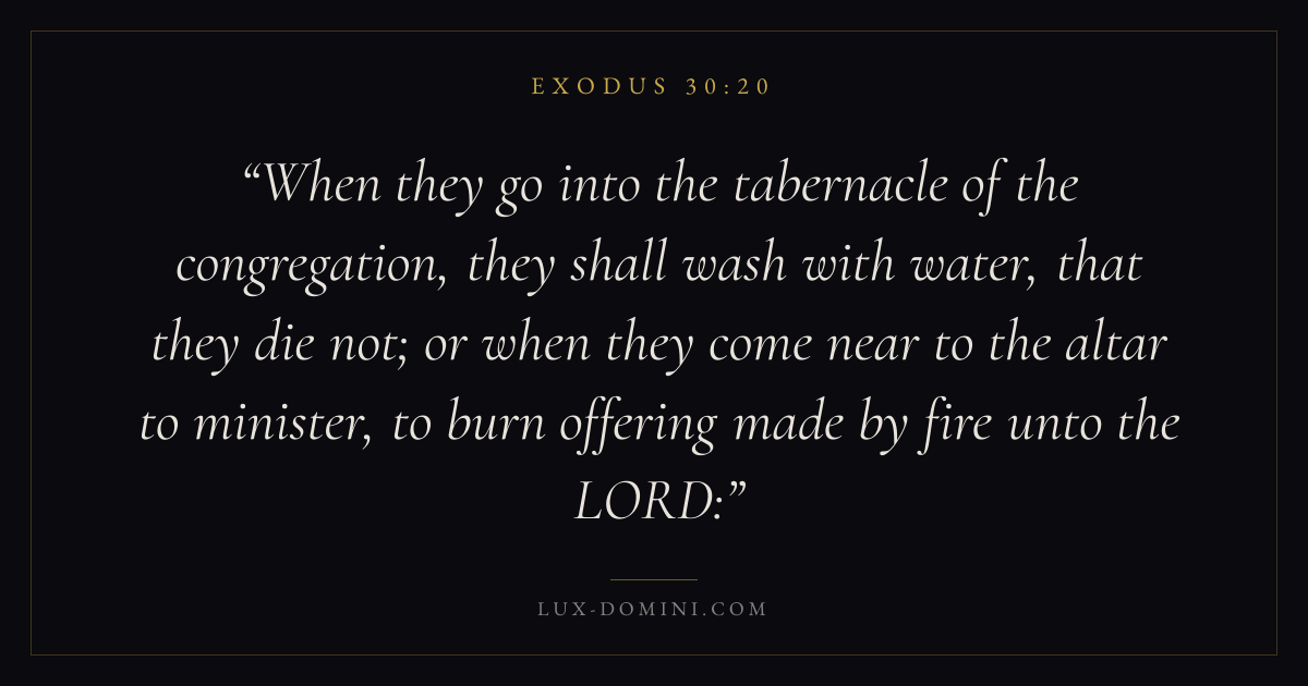 A large vessel of brass, holding water, was to be set near the door of the tabernacle. Aaron and his sons must wash their hands and feet at this laver, every time they went in to minister.