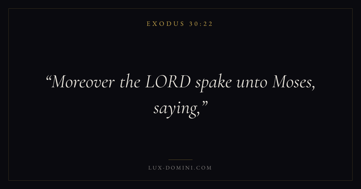 Books / Exodus / Chapter 30 / Verse 22 ← Exodus 30:21 Exodus 30:22 Exodus 30:23 → Moreover the LORD spake unto Moses, saying, Download verse card Share on Twitter Share on Facebook Pin it ✦ Key themes SalvationRedemptionPassoverCovenant Read with Exodus 30:23Exodus 30:24John 3:16Ephesians 2:8 Related topics Bible verses about salvation ✦ Exodus Chapter 30 verses V. 1 V. 2 V. 3 V. 4 V. 5 V. 6 V. 7 V. 8 V. 9 V. 10 V. 11 V. 12 V. 13 V. 14 V. 15 V. 16 V. 17 V. 18 V. 19 V. 20 V. 21 V. 22 V. 23 V. 24 V. 25 V. 26 V. 27 V. 28 V. 29 V. 30 V. 31 V. 32 V. 33 V. 34 V. 35 V. 36 V. 37 V. 38