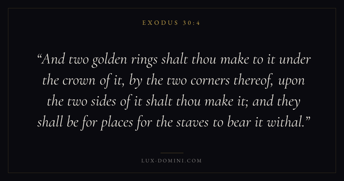And two golden rings shalt thou make to it under the crown of it, by the two corners thereof, upon the two sides of it shalt thou make it; and they shall be for places for the staves to bear it withal.