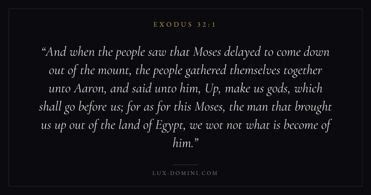 And when the people saw that Moses delayed to come down out of the mount, the people gathered themselves together unto Aaron, and said unto him, Up, make us gods, which shall go before us; for as for this Moses, the man that brought us up out of the land of Egypt, we wot not what is become of him.