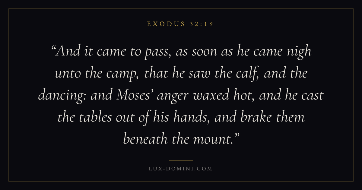 And it came to pass, as soon as he came nigh unto the camp, that he saw the calf, and the dancing: and Moses’ anger waxed hot, and he cast the tables out of his hands, and brake them beneath the mount.