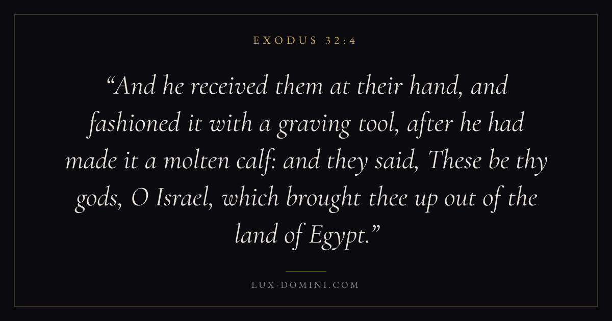 And he received them at their hand, and fashioned it with a graving tool, after he had made it a molten calf: and they said, These be thy gods, O Israel, which brought thee up out of the land of Egypt.