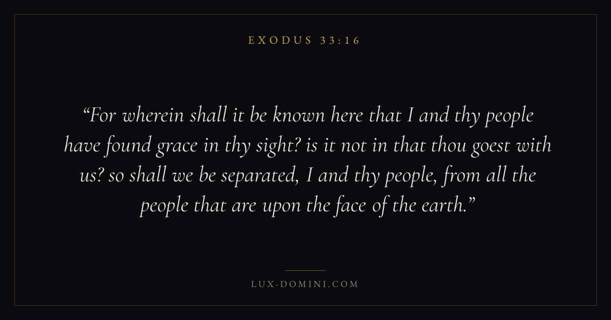 For wherein shall it be known here that I and thy people have found grace in thy sight? is it not in that thou goest with us? so shall we be separated, I and thy people, from all the people that are upon the face of the earth.