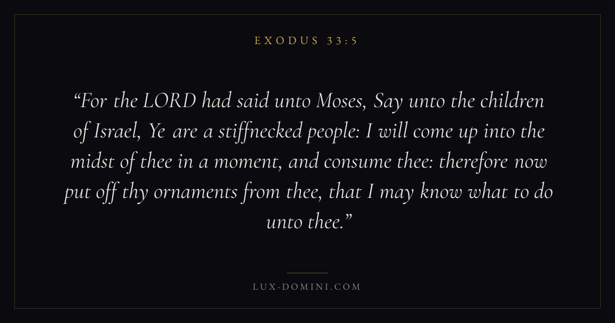 For the LORD had said unto Moses, Say unto the children of Israel, Ye are a stiffnecked people: I will come up into the midst of thee in a moment, and consume thee: therefore now put off thy ornaments from thee, that I may know what to do unto thee.