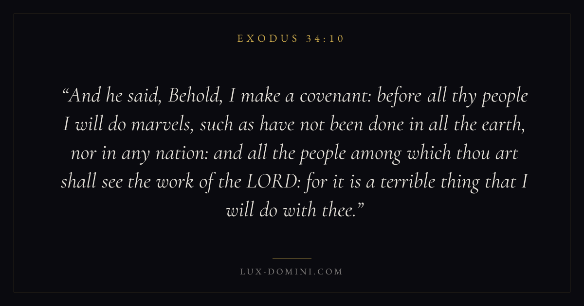 And he said, Behold, I make a covenant: before all thy people I will do marvels, such as have not been done in all the earth, nor in any nation: and all the people among which thou art shall see the work of the LORD: for it is a terrible thing that I will do with thee.