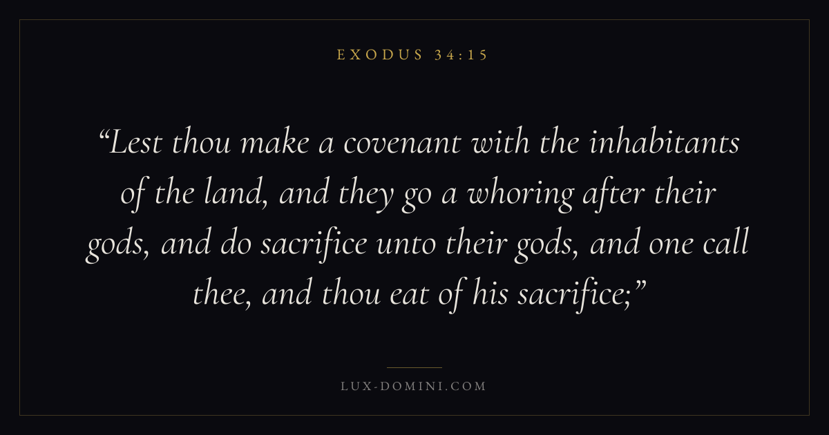Lest thou make a covenant with the inhabitants of the land, and they go a whoring after their gods, and do sacrifice unto their gods, and one call thee, and thou eat of his sacrifice;
