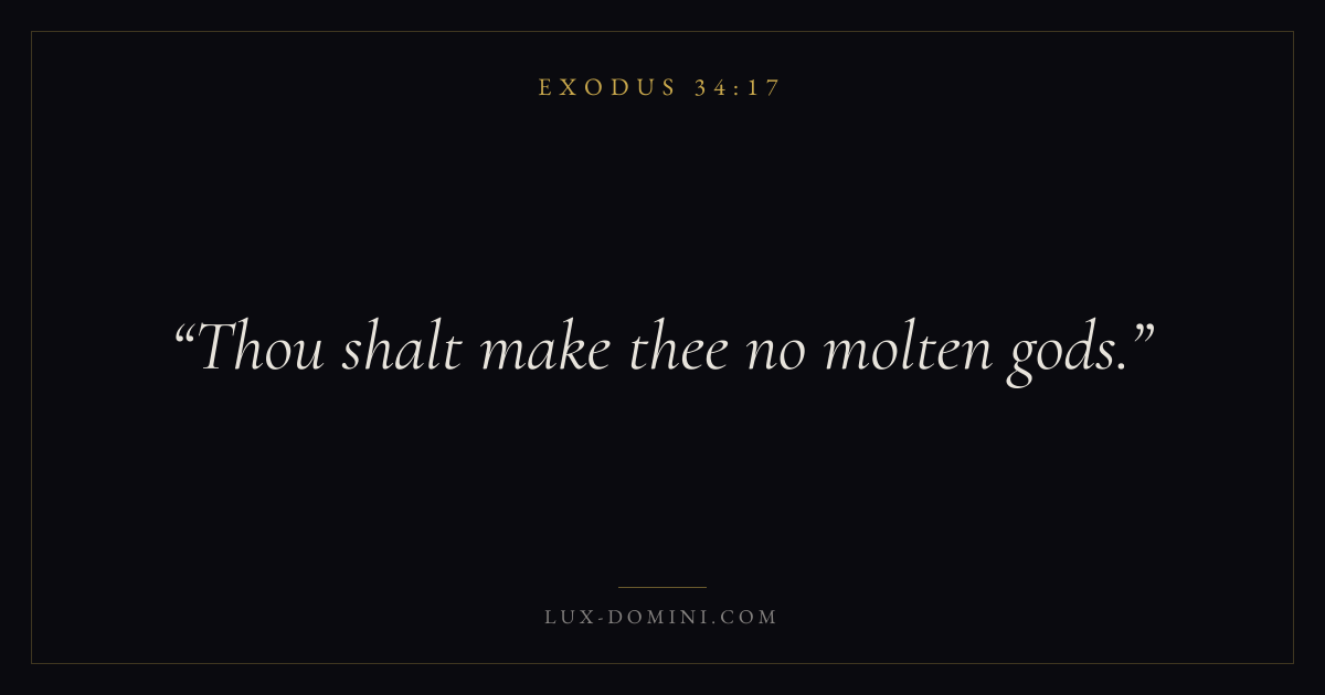 Books / Exodus / Chapter 34 / Verse 17 ← Exodus 34:16 Exodus 34:17 Exodus 34:18 → Thou shalt make thee no molten gods. Download verse card Share on Twitter Share on Facebook Pin it ✦ Key themes SalvationRedemptionPassoverCovenant Read with John 3:16Ephesians 2:8 Related topics Bible verses about salvation ✦ Exodus Chapter 34 verses V. 1 V. 2 V. 3 V. 4 V. 5 V. 6 V. 7 V. 8 V. 9 V. 10 V. 11 V. 12 V. 13 V. 14 V. 15 V. 16 V. 17 V. 18 V. 19 V. 20 V. 21 V. 22 V. 23 V. 24 V. 25 V. 26 V. 27 V. 28 V. 29 V. 30 V. 31 V. 32 V. 33 V. 34 V. 35