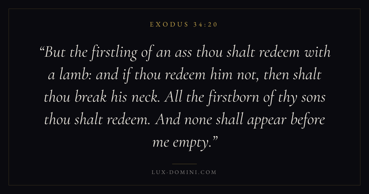 But the firstling of an ass thou shalt redeem with a lamb: and if thou redeem him not, then shalt thou break his neck. All the firstborn of thy sons thou shalt redeem. And none shall appear before me empty.