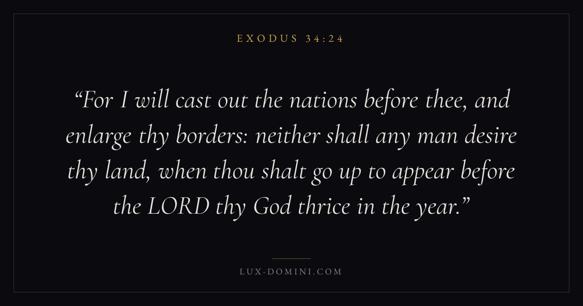 For I will cast out the nations before thee, and enlarge thy borders: neither shall any man desire thy land, when thou shalt go up to appear before the LORD thy God thrice in the year.