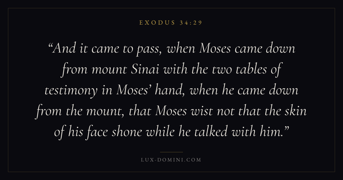 And it came to pass, when Moses came down from mount Sinai with the two tables of testimony in Moses’ hand, when he came down from the mount, that Moses wist not that the skin of his face shone while he talked with him.