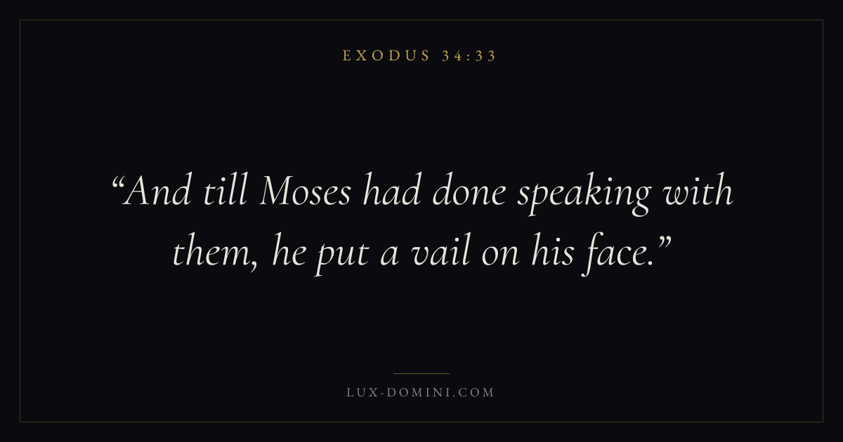 Books / Exodus / Chapter 34 / Verse 33 ← Exodus 34:32 Exodus 34:33 Exodus 34:34 → And till Moses had done speaking with them, he put a vail on his face. Download verse card Share on Twitter Share on Facebook Pin it ✦ Key themes SalvationRedemptionPassoverCovenant Read with Exodus 34:29Exodus 34:30John 3:16Ephesians 2:8 Related topics Bible verses about salvation ✦ Exodus Chapter 34 verses V. 1 V. 2 V. 3 V. 4 V. 5 V. 6 V. 7 V. 8 V. 9 V. 10 V. 11 V. 12 V. 13 V. 14 V. 15 V. 16 V. 17 V. 18 V. 19 V. 20 V. 21 V. 22 V. 23 V. 24 V. 25 V. 26 V. 27 V. 28 V. 29 V. 30 V. 31 V. 32 V. 33 V. 34 V. 35