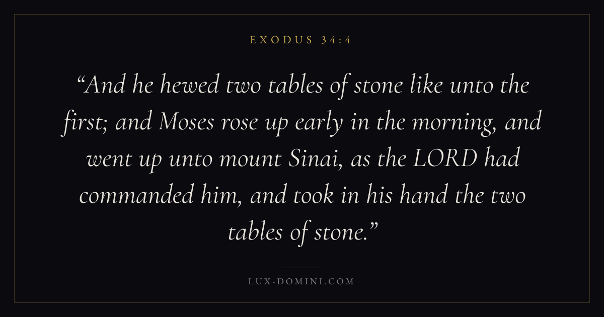 And he hewed two tables of stone like unto the first; and Moses rose up early in the morning, and went up unto mount Sinai, as the LORD had commanded him, and took in his hand the two tables of stone.