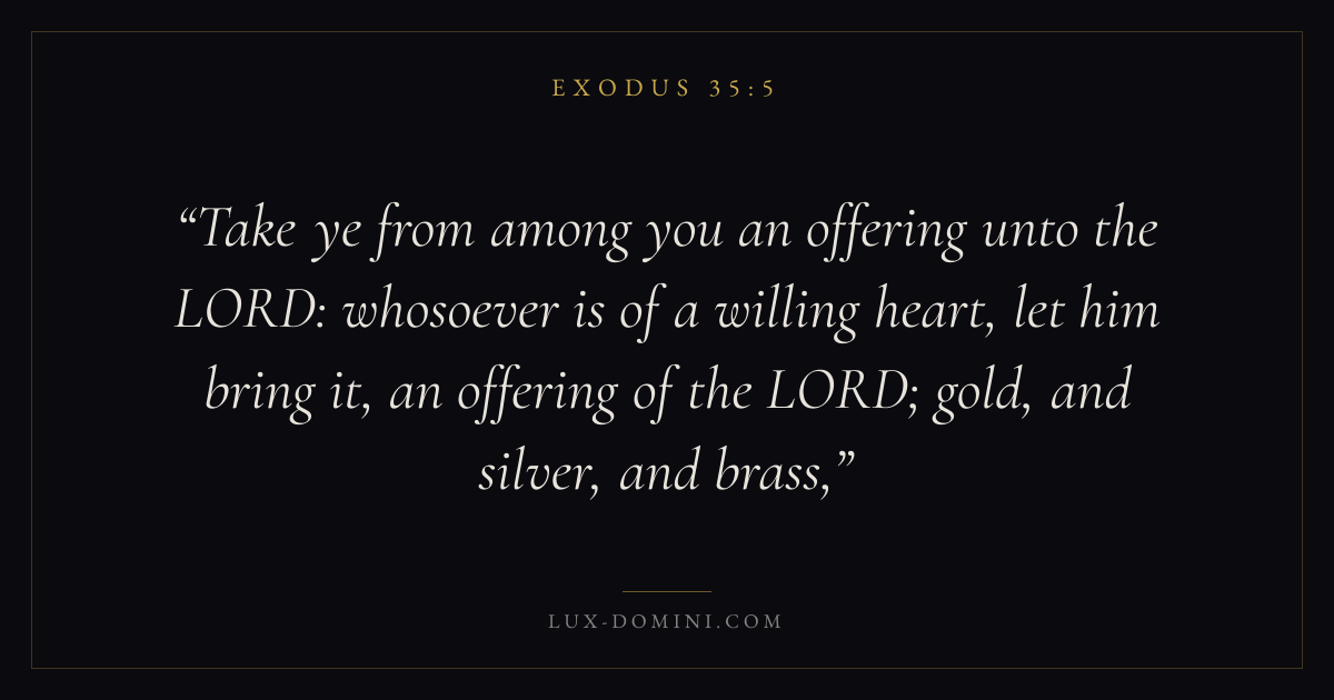 Take ye from among you an offering unto the LORD: whosoever is of a willing heart, let him bring it, an offering of the LORD; gold, and silver, and brass,