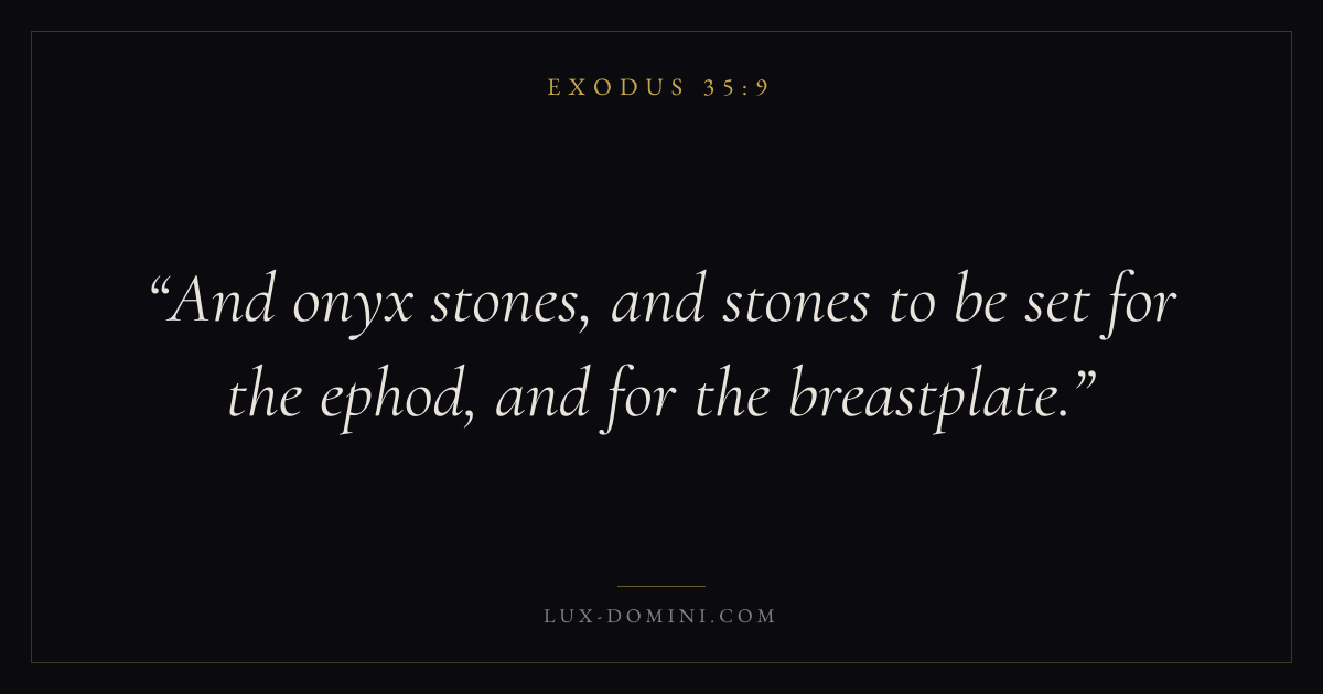 Books / Exodus / Chapter 35 / Verse 9 ← Exodus 35:8 Exodus 35:9 Exodus 35:10 → And onyx stones, and stones to be set for the ephod, and for the breastplate. Download verse card Share on Twitter Share on Facebook Pin it ✦ Key themes SalvationRedemptionPassoverCovenant Read with Exodus 35:10Exodus 35:11John 3:16Ephesians 2:8 Related topics Bible verses about salvation ✦ Exodus Chapter 35 verses V. 1 V. 2 V. 3 V. 4 V. 5 V. 6 V. 7 V. 8 V. 9 V. 10 V. 11 V. 12 V. 13 V. 14 V. 15 V. 16 V. 17 V. 18 V. 19 V. 20 V. 21 V. 22 V. 23 V. 24 V. 25 V. 26 V. 27 V. 28 V. 29 V. 30 V. 31 V. 32 V. 33 V. 34 V. 35