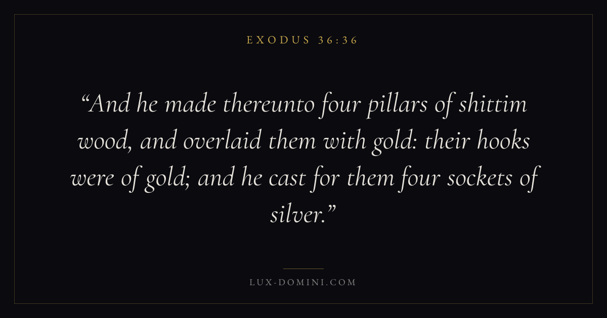 And he made thereunto four pillars of shittim wood, and overlaid them with gold: their hooks were of gold; and he cast for them four sockets of silver.