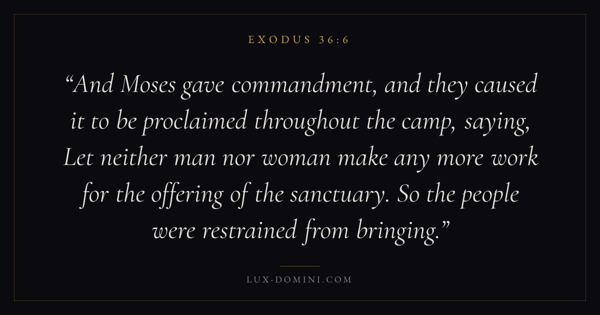 And Moses gave commandment, and they caused it to be proclaimed throughout the camp, saying, Let neither man nor woman make any more work for the offering of the sanctuary. So the people were restrained from bringing.