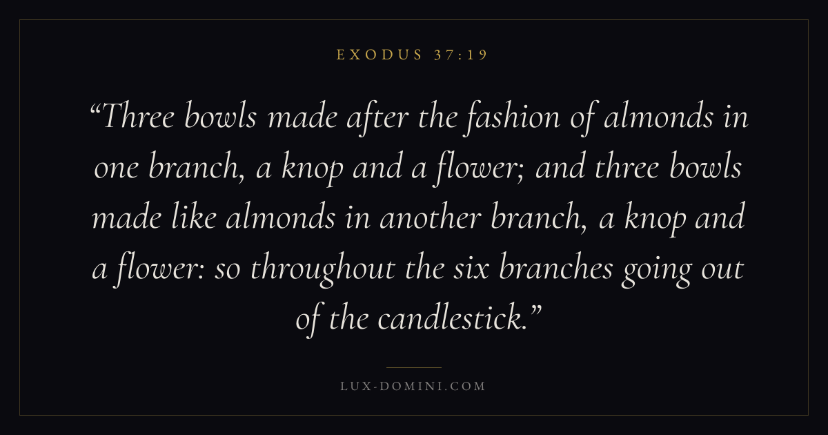 Three bowls made after the fashion of almonds in one branch, a knop and a flower; and three bowls made like almonds in another branch, a knop and a flower: so throughout the six branches going out of the candlestick.