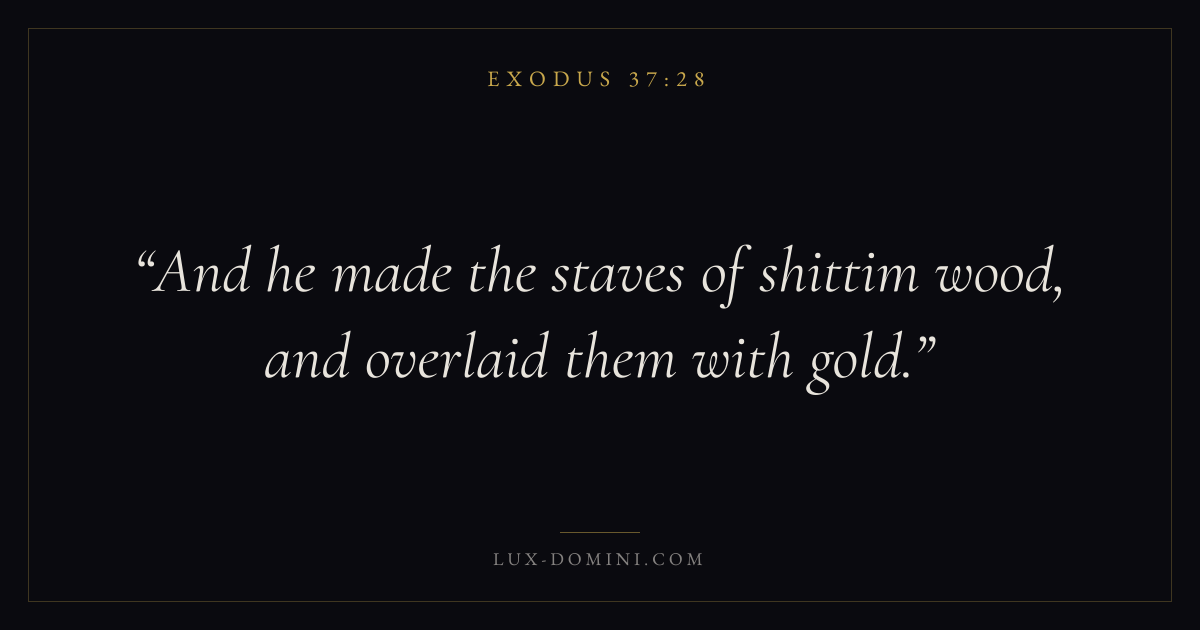 Books / Exodus / Chapter 37 / Verse 28 ← Exodus 37:27 Exodus 37:28 Exodus 37:29 → And he made the staves of shittim wood, and overlaid them with gold. Download verse card Share on Twitter Share on Facebook Pin it ✦ Key themes SalvationRedemptionPassoverCovenant Read with Exodus 37:25Exodus 37:26John 3:16Ephesians 2:8 Related topics Bible verses about salvation ✦ Exodus Chapter 37 verses V. 1 V. 2 V. 3 V. 4 V. 5 V. 6 V. 7 V. 8 V. 9 V. 10 V. 11 V. 12 V. 13 V. 14 V. 15 V. 16 V. 17 V. 18 V. 19 V. 20 V. 21 V. 22 V. 23 V. 24 V. 25 V. 26 V. 27 V. 28 V. 29