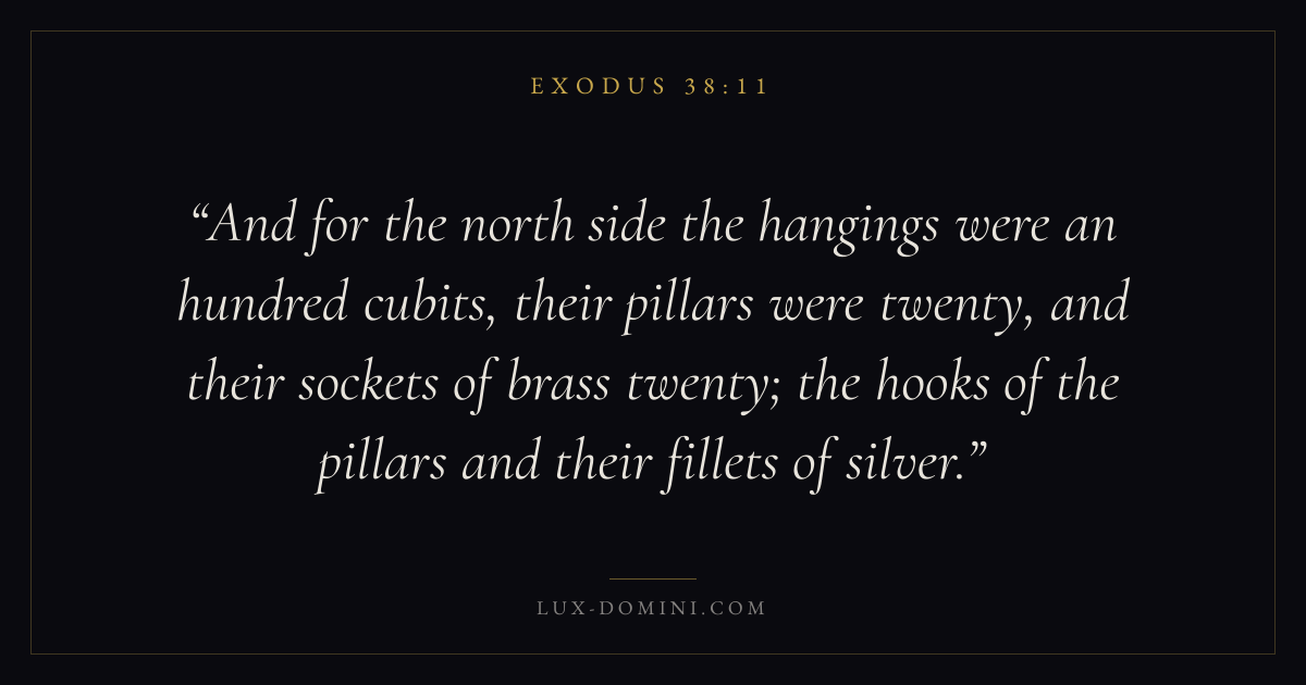 And for the north side the hangings were an hundred cubits, their pillars were twenty, and their sockets of brass twenty; the hooks of the pillars and their fillets of silver.