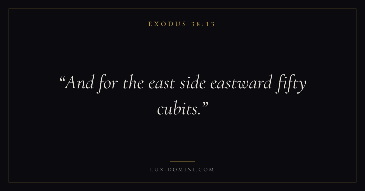 Books / Exodus / Chapter 38 / Verse 13 ← Exodus 38:12 Exodus 38:13 Exodus 38:14 → And for the east side eastward fifty cubits. Download verse card Share on Twitter Share on Facebook Pin it ✦ Key themes SalvationRedemptionPassoverCovenant Read with Exodus 38:9Exodus 38:10John 3:16Ephesians 2:8 Related topics Bible verses about salvation ✦ Exodus Chapter 38 verses V. 1 V. 2 V. 3 V. 4 V. 5 V. 6 V. 7 V. 8 V. 9 V. 10 V. 11 V. 12 V. 13 V. 14 V. 15 V. 16 V. 17 V. 18 V. 19 V. 20 V. 21 V. 22 V. 23 V. 24 V. 25 V. 26 V. 27 V. 28 V. 29 V. 30 V. 31