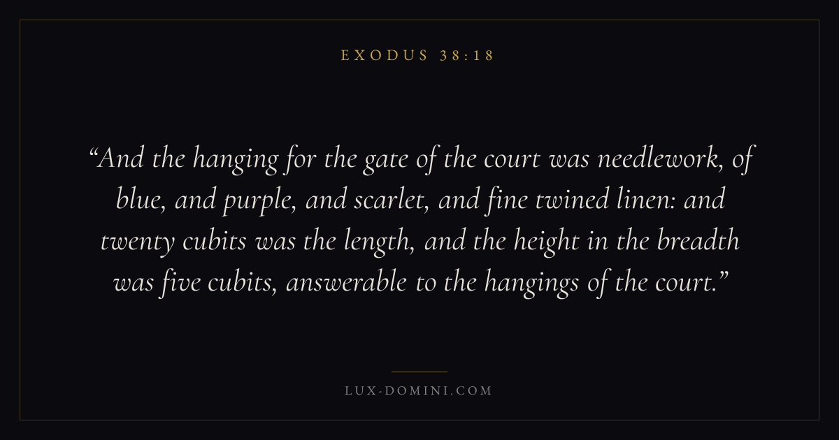 And the hanging for the gate of the court was needlework, of blue, and purple, and scarlet, and fine twined linen: and twenty cubits was the length, and the height in the breadth was five cubits, answerable to the hangings of the court.