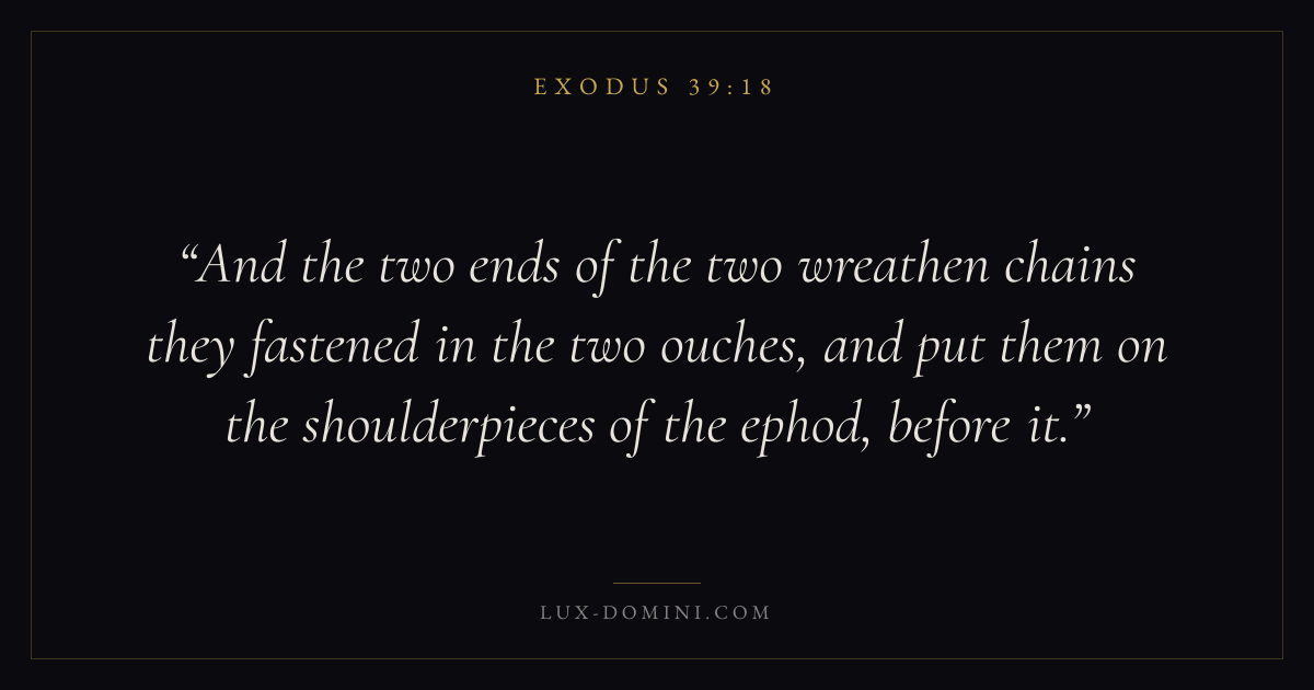 And the two ends of the two wreathen chains they fastened in the two ouches, and put them on the shoulderpieces of the ephod, before it.