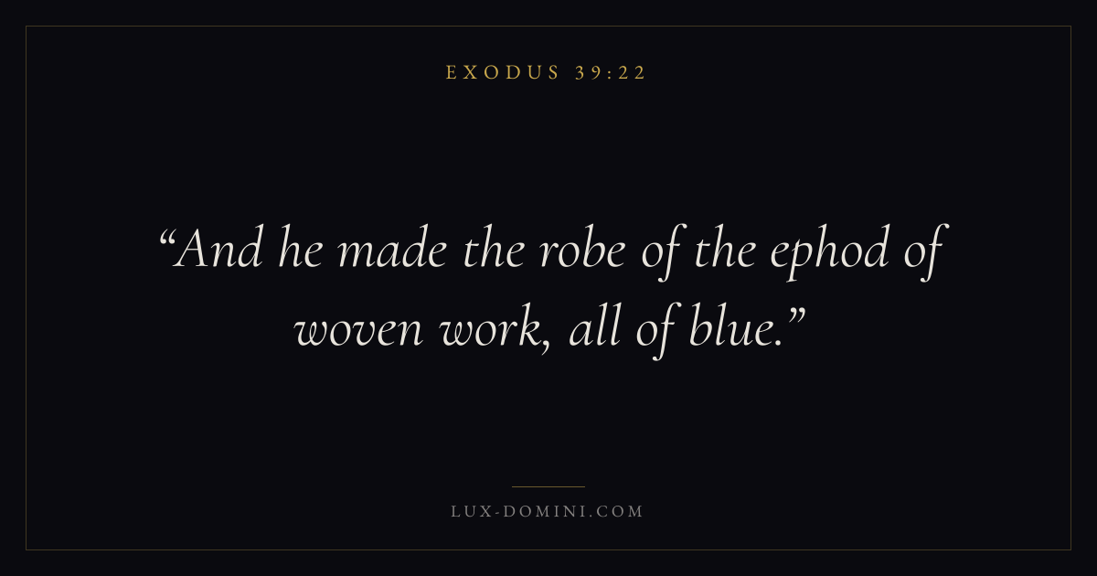 Books / Exodus / Chapter 39 / Verse 22 ← Exodus 39:21 Exodus 39:22 Exodus 39:23 → And he made the robe of the ephod of woven work, all of blue. Download verse card Share on Twitter Share on Facebook Pin it ✦ Key themes SalvationGraceRedemptionPassover Read with Exodus 39:23Exodus 39:24John 3:16Ephesians 2:8 Related topics Bible verses about salvationBible verses about grace ✦ Exodus Chapter 39 verses V. 1 V. 2 V. 3 V. 4 V. 5 V. 6 V. 7 V. 8 V. 9 V. 10 V. 11 V. 12 V. 13 V. 14 V. 15 V. 16 V. 17 V. 18 V. 19 V. 20 V. 21 V. 22 V. 23 V. 24 V. 25 V. 26 V. 27 V. 28 V. 29 V. 30 V. 31 V. 32 V. 33 V. 34 V. 35 V. 36 V. 37 V. 38 V. 39 V. 40 V. 41 V. 42 V. 43