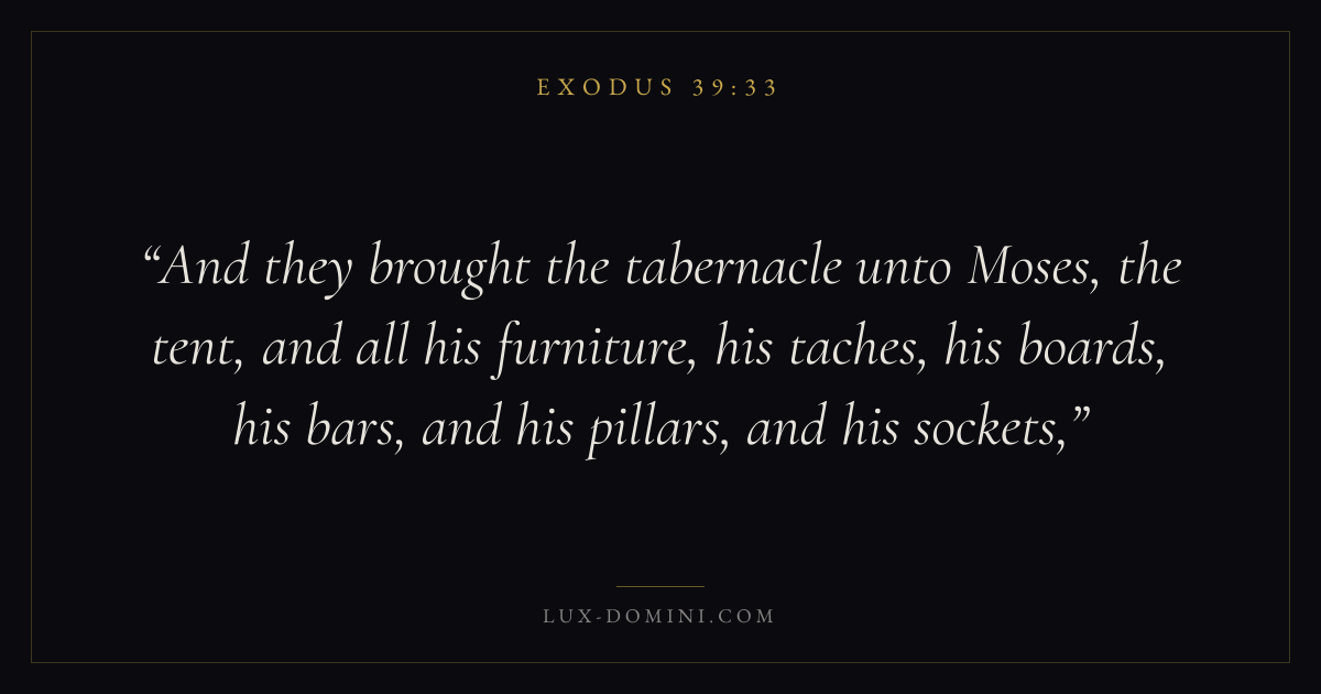 And they brought the tabernacle unto Moses, the tent, and all his furniture, his taches, his boards, his bars, and his pillars, and his sockets,