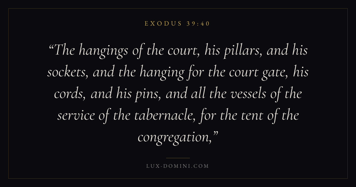 The hangings of the court, his pillars, and his sockets, and the hanging for the court gate, his cords, and his pins, and all the vessels of the service of the tabernacle, for the tent of the congregation,
