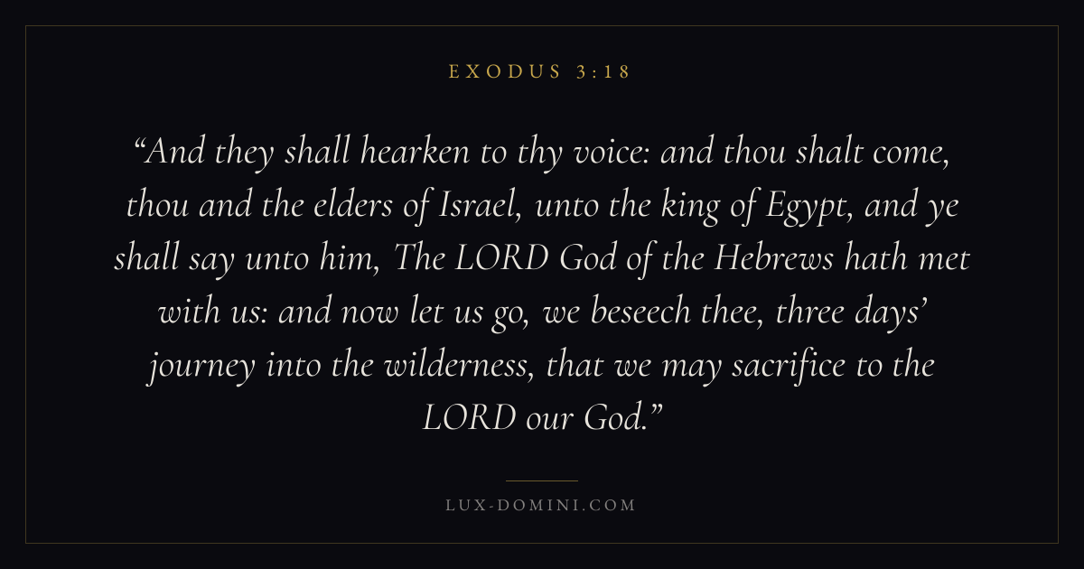 And they shall hearken to thy voice: and thou shalt come, thou and the elders of Israel, unto the king of Egypt, and ye shall say unto him, The LORD God of the Hebrews hath met with us: and now let us go, we beseech thee, three days’ journey into the wilderness, that we may sacrifice to the LORD our God.