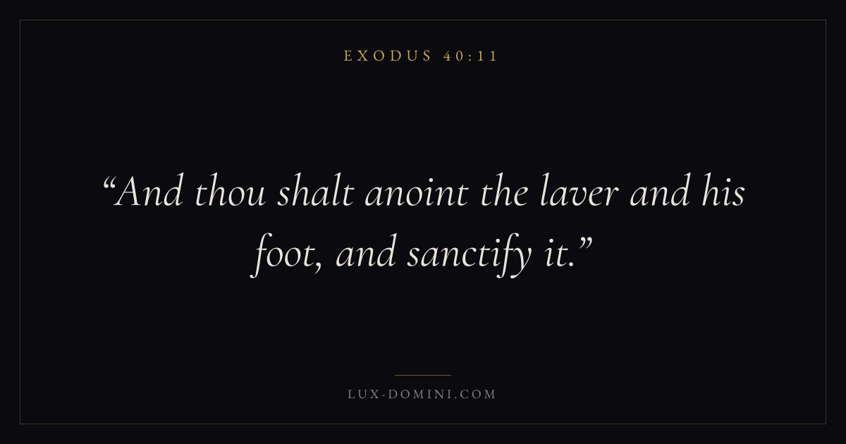 Books / Exodus / Chapter 40 / Verse 11 ← Exodus 40:10 Exodus 40:11 Exodus 40:12 → And thou shalt anoint the laver and his foot, and sanctify it. Download verse card Share on Twitter Share on Facebook Pin it ✦ Key themes SalvationRedemptionPassoverCovenant Read with Exodus 40:12Exodus 40:13John 3:16Ephesians 2:8 Related topics Bible verses about salvation ✦ Exodus Chapter 40 verses V. 1 V. 2 V. 3 V. 4 V. 5 V. 6 V. 7 V. 8 V. 9 V. 10 V. 11 V. 12 V. 13 V. 14 V. 15 V. 16 V. 17 V. 18 V. 19 V. 20 V. 21 V. 22 V. 23 V. 24 V. 25 V. 26 V. 27 V. 28 V. 29 V. 30 V. 31 V. 32 V. 33 V. 34 V. 35 V. 36 V. 37 V. 38