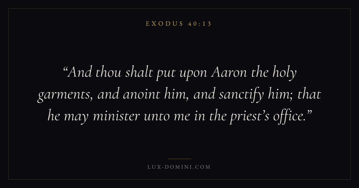 And thou shalt put upon Aaron the holy garments, and anoint him, and sanctify him; that he may minister unto me in the priest’s office.