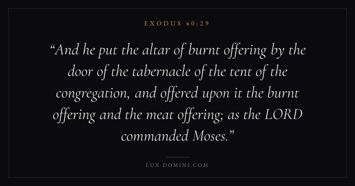 And he put the altar of burnt offering by the door of the tabernacle of the tent of the congregation, and offered upon it the burnt offering and the meat offering; as the LORD commanded Moses.
