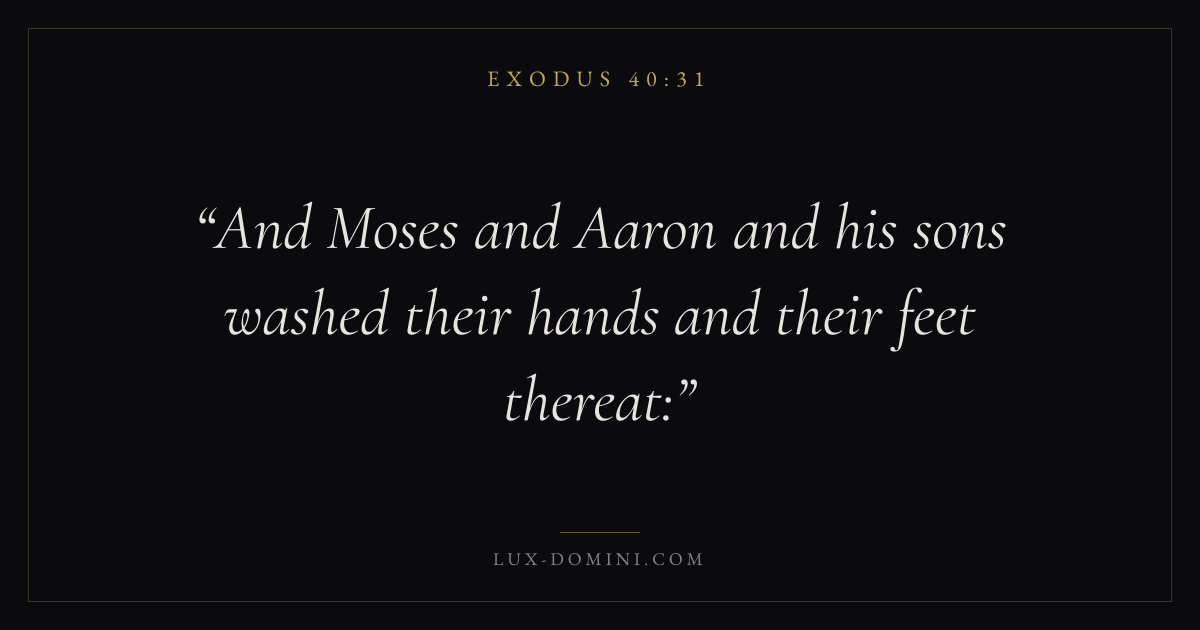 Books / Exodus / Chapter 40 / Verse 31 ← Exodus 40:30 Exodus 40:31 Exodus 40:32 → And Moses and Aaron and his sons washed their hands and their feet thereat: Download verse card Share on Twitter Share on Facebook Pin it ✦ Key themes SalvationRedemptionPassoverCovenant Read with Exodus 40:30Exodus 40:32John 3:16Ephesians 2:8 Related topics Bible verses about salvation ✦ Exodus Chapter 40 verses V. 1 V. 2 V. 3 V. 4 V. 5 V. 6 V. 7 V. 8 V. 9 V. 10 V. 11 V. 12 V. 13 V. 14 V. 15 V. 16 V. 17 V. 18 V. 19 V. 20 V. 21 V. 22 V. 23 V. 24 V. 25 V. 26 V. 27 V. 28 V. 29 V. 30 V. 31 V. 32 V. 33 V. 34 V. 35 V. 36 V. 37 V. 38